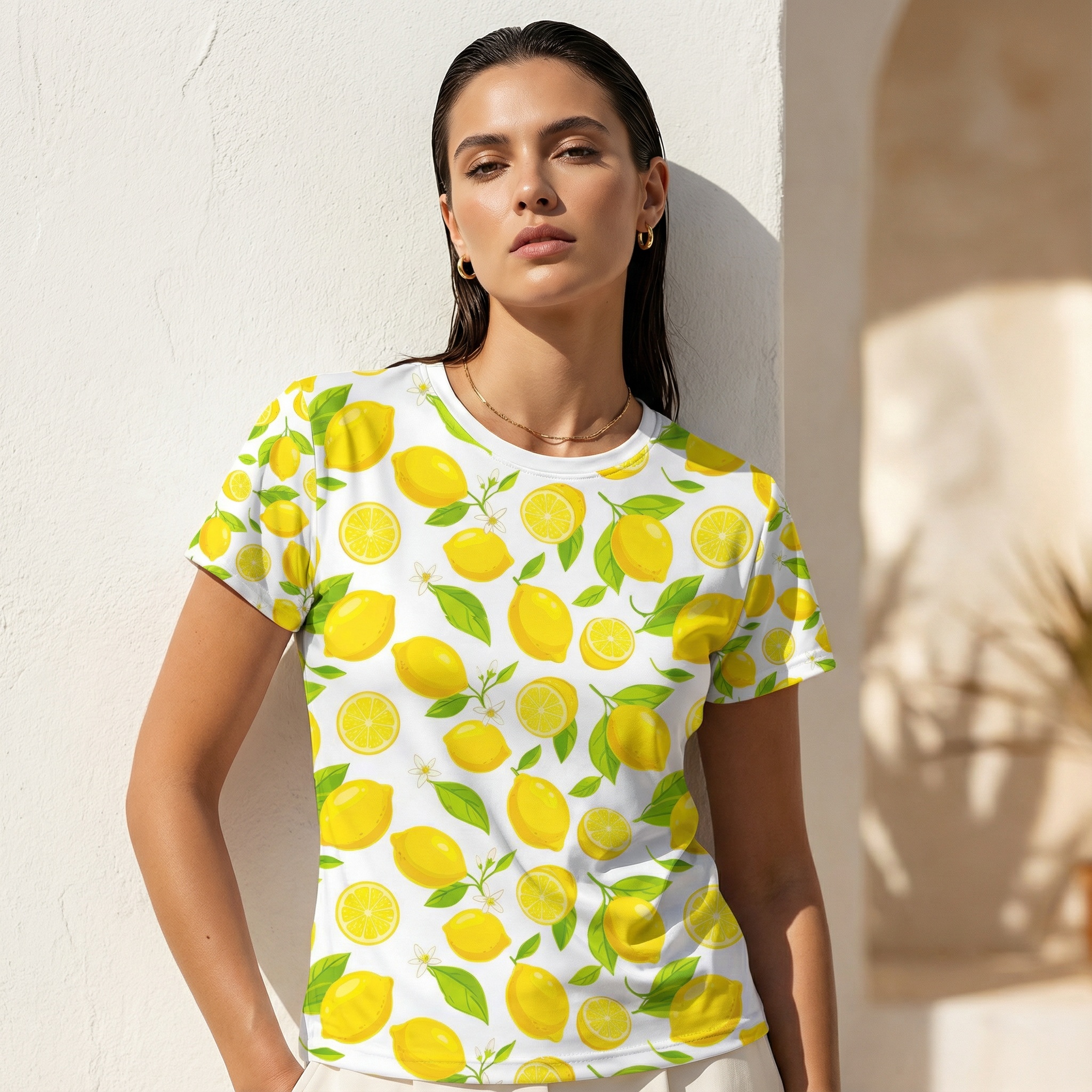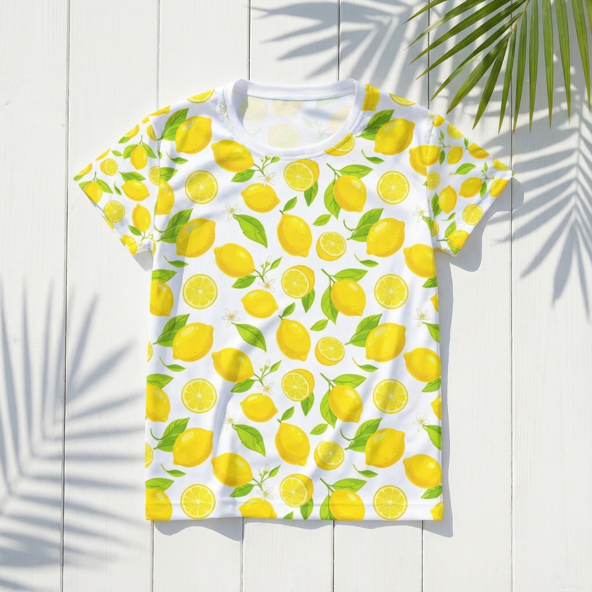 - "A t-shirt folded on a rustic wooden table next to a pumpkin spice latte, autumn leaves in background"